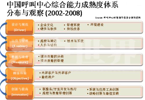 在過(guò)去幾年我們也做了很多研究,一個(gè)呼叫中心整合持續(xù)建設(shè)在哪些方面應(yīng)該做定義;旧衔覀兪欠譃槲鍌(gè)方面,在每一級(jí)的成熟度方面,我們的呼叫中心都關(guān)注自己的成熟度。1、設(shè)計(jì)與規(guī)范;2、運(yùn)營(yíng)管理;3、數(shù)據(jù)與績(jī)效;4、顧客體驗(yàn);5、創(chuàng)新與提高。第五方面創(chuàng)新與提高在CMM模型中是特有的,它在整個(gè)產(chǎn)業(yè)的發(fā)展過(guò)程中,提供戰(zhàn)略革新和戰(zhàn)略工具一體化使用的指導(dǎo)框架和最佳實(shí)踐。