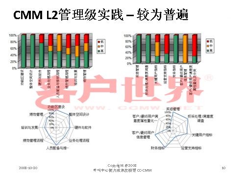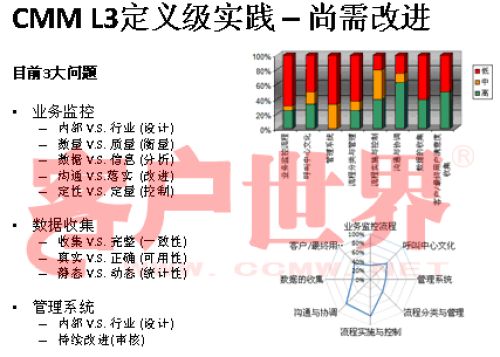 接下來(lái)我用一個(gè)很小的案例結(jié)束今天的分享,我們整個(gè)的呼叫中心的成熟度模型目前是在電信行業(yè)開(kāi)始了2008年版的推廣,成熟度模型經(jīng)歷從07年成立亞太呼叫中心產(chǎn)業(yè)聯(lián)盟以后,由一群這個(gè)行業(yè)里面的專家,特別是中國(guó)產(chǎn)業(yè)市場(chǎng)的發(fā)展建立起的標(biāo)準(zhǔn),一年以來(lái)在通信行業(yè)我們做的能力成熟度的判定有一些很有意思的啟示,通信行業(yè)占到我們整個(gè)呼叫中心產(chǎn)業(yè)約70%的坐席,是最大的、最有代表性的產(chǎn)業(yè)。做下來(lái)真的很有代表性,普遍性在于環(huán)境建設(shè)、資產(chǎn)投入、資產(chǎn)配置,所以這下面的雷達(dá)就可以看到,相對(duì)完善都是在環(huán)境建設(shè),功能區(qū)建設(shè),整體空間設(shè)計(jì)、硬件相對(duì)來(lái)說(shuō)比較偏硬的一些。在其他方面偏廢的比較厲害。第二個(gè)雷達(dá)在一些獎(jiǎng)懲管理、信息管理,整個(gè)軟性方面幾乎有很濃重的一些計(jì)劃經(jīng)濟(jì),制造行業(yè)的一些領(lǐng)域相對(duì)來(lái)說(shuō)比較成熟。我們目前看到的,基本上通信行業(yè)的一些發(fā)展在能力成熟度上是二級(jí)到四級(jí),尤其以二到三級(jí)的發(fā)展更為普遍。通常的方法為期一周的標(biāo)桿調(diào)研,看所有的呼叫中心發(fā)展的五個(gè)方面,我們才會(huì)在里面做這樣的判定。在能力成熟度的三級(jí),我們做了一些企業(yè)發(fā)現(xiàn),特別在三級(jí),關(guān)于能不能對(duì)流程進(jìn)行一致性管理方面,就是剛才李老師講到的不是最急的,而管理是最重要的?赡芩械牧鞒潭喽嗌偕儆幸恍┏墒於鹊膯(wèn)題,但是我們的源頭流程能力在三個(gè)方面有很大的差距:一個(gè)是業(yè)務(wù)監(jiān)控流程,第二個(gè)數(shù)據(jù)收集流程,還有一個(gè)是管理系統(tǒng)的審核流程。這個(gè)大家可以和自己的呼叫中心比一比。