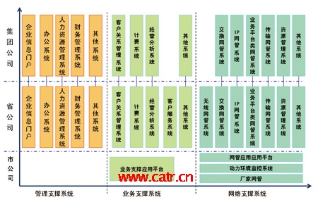 從系統(tǒng)部署來看,目前各大運營企業(yè)都以集團與省公司為主要的建設與管理維護單位,建成了集團與省兩級模式的支撐系統(tǒng)。集團公司的系統(tǒng)主要提供面向全公司的企業(yè)管理、經營分析等功能;省公司從職能管理單位逐步轉向了兼顧管理、生產的單位,具有了越來越多的生產職能,在運營支撐系統(tǒng)建設中的作用較為突出,一般情況下,在遵循集團公司的總體指導思想下,可自行規(guī)劃與建設本省的支撐系統(tǒng);市公司的生產職能有所削弱,主要負責市場營銷、客戶支撐以及設備的現(xiàn)場維護等工作,因而主要是支撐系統(tǒng)的使用單位。