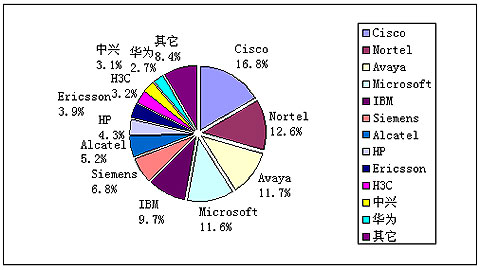 賽迪顧問預(yù)測,2009年中國統(tǒng)一通信市場中,在通信設(shè)備領(lǐng)域,Cisco市場份額將達(dá)到16.8%,繼續(xù)保持領(lǐng)頭樣的位置,而且市場份額有望繼續(xù)增加,Nortel和Avaya緊隨其后,市場份額分別將達(dá)到12.6%和11.7%。而在軟件廠商方面,Microsoft和IBM將繼續(xù)保持市場領(lǐng)先地位,市場份額分別將達(dá)到11.6%和9.7%,增長勢頭強勁。其它市場份額較大的國外統(tǒng)一通信廠商還有西門子、阿爾卡特、愛立信、HP等。在國內(nèi)方面,中興和H3C分別以約3%的市場份額占據(jù)領(lǐng)先位置。