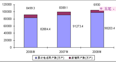 圖2 2006-2008年電話用戶數(shù)及新增用戶數(shù)