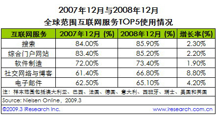 iResearch艾瑞咨詢根據(jù)NielsenOnline公布的全球范圍內(nèi)排名前五位的互聯(lián)網(wǎng)服務(wù)使用情況發(fā)現(xiàn),2008年在全球范圍內(nèi),社交網(wǎng)絡(luò)與博客的發(fā)展最為迅速。數(shù)據(jù)顯示,在包括搜索、綜合門戶網(wǎng)站、軟件制造、社交網(wǎng)絡(luò)與博客以及電子郵件在內(nèi)的五項互聯(lián)網(wǎng)服務(wù)中,相對2007年12月,2008年12月社交網(wǎng)絡(luò)與博客的使用情況增長率最高,達8.8%。而搜索、綜合門戶網(wǎng)站、軟件制造的增長率,分別為2.3%、2.2%、1.9%,均不足社交網(wǎng)絡(luò)與博客增長率的二分之一。高增長帶動社交網(wǎng)絡(luò)與博客服務(wù)在2008年12月以66.8%的使用率反超電子郵件(65.1%),躍居TOP5網(wǎng)絡(luò)服務(wù)第四位。