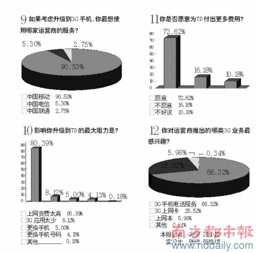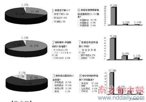 1、中國移動的3G口號是?超過98%的被訪者選擇了“引領3G生活”這一正確選項。2、你是否考慮升級到3G手機?選擇“會升級”的接近80%。如果考慮升級到3G手機,你最想使用哪家運營商的服務?中國移動奪得了超過九成的選票。但當最后問到,“你印象中,中國移動的3G標準是?”時,正確選項T D -SCD M A的得票率竟只有三成左右。