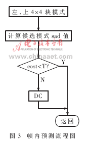 (4)算法替代和改進(jìn)。幀間預(yù)測(cè)的改進(jìn):關(guān)于算法的改進(jìn)主要集中在對(duì)me(motion estimation)的改進(jìn)上,流程如圖2所示。costmin1=min(cost16,cost8,cost16×8,cost8×16),costmin2=min(costmin1,costsub),依次在16×16、8×8、16×8和8×16大小宏塊的整像素位置做預(yù)測(cè),再做次像素估計(jì)和幀內(nèi)預(yù)測(cè),選用匹配準(zhǔn)則函數(shù)(采用sad作為匹配準(zhǔn)則函數(shù))取得最小值的模式進(jìn)行編碼。每計(jì)算一種模式,都將sad值與一個(gè)經(jīng)驗(yàn)閥值做比較。當(dāng)sad值小于這個(gè)閥值時(shí),立即結(jié)束運(yùn)動(dòng)估計(jì),從而減少運(yùn)算量。