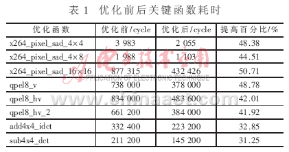 采用以上優(yōu)化方法對(duì)編碼關(guān)鍵函數(shù)進(jìn)行優(yōu)化,優(yōu)化前后函數(shù)耗時(shí)如表1所示?梢,以上優(yōu)化方法能大幅度減少編碼時(shí)間。