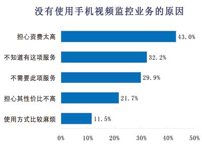 諾達(dá)咨詢對沒有使用手機(jī)視頻監(jiān)控的用戶原因進(jìn)行調(diào)查,結(jié)果表明,43%的用戶擔(dān)心資費太高,其次對手機(jī)監(jiān)控不了解和不需要此項服務(wù)的用戶各占32%、30%。22%的用戶擔(dān)心性價比不高,12%用戶因為使用比較麻煩而不選擇手機(jī)視頻監(jiān)控服務(wù)。