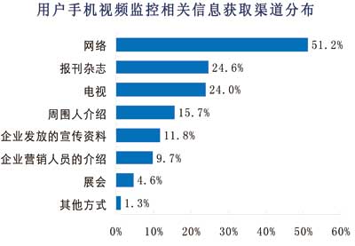 另一方面,運營商的宣傳不到位。從諾達(dá)咨詢調(diào)查數(shù)據(jù)來看,用戶目前獲得手機(jī)視頻監(jiān)控相關(guān)信息的主要渠道是互聯(lián)網(wǎng),有51%的用戶是通過互聯(lián)網(wǎng)了解手機(jī)視頻監(jiān)控的,而從傳統(tǒng)的電視媒體和報刊雜志獲得相關(guān)信息的用戶僅僅約各占24%,通過相關(guān)手機(jī)視頻監(jiān)控企業(yè)發(fā)放宣傳資料和介紹獲取相關(guān)信息的用戶各占12%和10%。由此可見,手機(jī)視頻監(jiān)控的宣傳尚不到位,導(dǎo)致消費者不能通過多方渠道獲取相關(guān)信息。