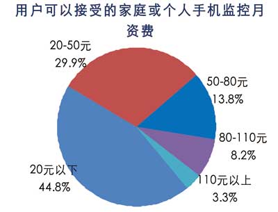 諾達(dá)咨詢調(diào)查數(shù)據(jù)表明,用戶可以接受的手機(jī)監(jiān)控月資費以20元以下居多,占45%,其次20-50元占30%,50-80元占14%。