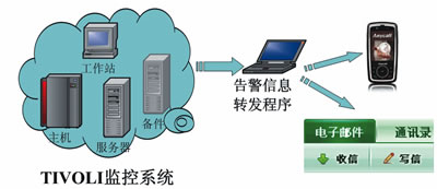 在具體實施上,為了形成統(tǒng)一的體系以方便監(jiān)控并達到告警信息與實時的反饋,可將以上4個層面因素納入IBM公司開發(fā)的TIVOLI監(jiān)控系統(tǒng)。除此之外,為實現(xiàn)告警信息的自動推送與分發(fā),可將自行開發(fā)告警信息轉(zhuǎn)發(fā)程序接入TIVOLI監(jiān)控系統(tǒng)信息庫。一旦檢測到異常信息存在則立即進行短信或郵件的發(fā)送,確保維護人員及時了解接口系統(tǒng)運行情況。整個過程如圖2所示。