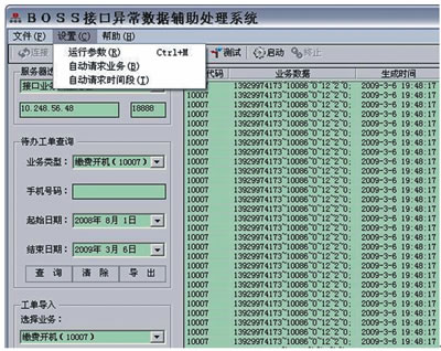 利用BOSS接口異常數(shù)據(jù)輔助處理系統(tǒng)執(zhí)行以上應(yīng)急流程的方式是:在提取號碼后,根據(jù)客服協(xié)議開機命令字10007格式要求(HandsetNo~工號~返回格式~nCode~sType~備注),將批量號碼構(gòu)造成報文列表并導(dǎo)入系統(tǒng)執(zhí)行。主界面如圖5所示。