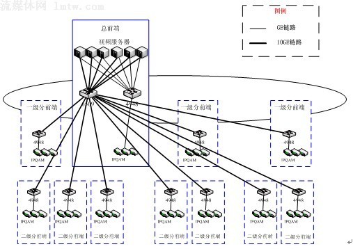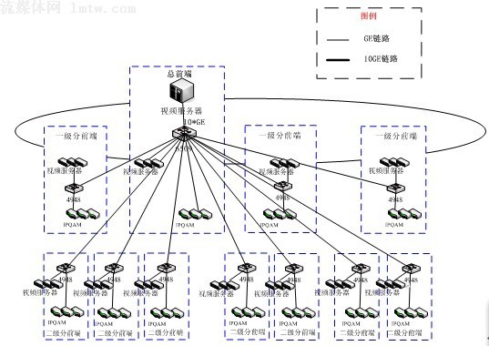 方案二:全集中式。在總前端集中部署若干臺視頻服務(wù)器,通過萬兆網(wǎng)絡(luò)直接向各分前端提供視頻流服務(wù);示意圖如下: