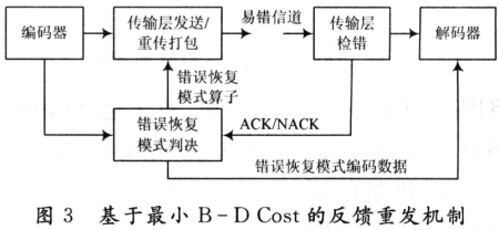 式中:rg是指出錯的部分被正確重傳到接收端的比特數。當r0≥(1-p)r+pr/(1-p)時,所有出錯的比特都實現了重傳,所以終端接收失真等于編碼端失真。否則,則按照式(7)中的兩個關系式,即可得到d0關于r0的表達式(5)。確立了上述關系后,結合相關的容錯平臺,設計出基于B-DCost的反饋重發(fā)機制,其原理框圖如圖3所示。