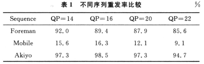 為了更全面評價本算法的性能,對不同測試序列在同樣丟包率情況下對本章的機制進行性能測試?紤]到影響本章算法性能的包括序列的紋理復雜程度以及運動劇烈程度。這里利用運動較為劇烈但紋理相對較單一的Foreman序列,紋理復雜程度較高的Mobile以及運動程度較低的Akiyo序列作為評測序列。表1是對這三個測試序列在QP=14,16,20,22,丟包率為3%的情況下前100幀做的統計,其中出錯Slice個數為24,則出錯宏塊總數為24×11=264。令NMB=264,則根據模式判決結果,即可得到對重發(fā)率的統計。