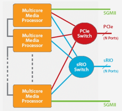 圖3說(shuō)明,高速串行I/O在復(fù)雜視頻處理任務(wù)中的潛在應(yīng)用。圖中顯示用于擴(kuò)展多個(gè)器件中多核器件處理能力的連接方案,其可以實(shí)現(xiàn)更復(fù)雜的視頻處理運(yùn)算或支持更多視頻轉(zhuǎn)碼通道。采用sRIO開(kāi)關(guān)能夠?qū)崿F(xiàn)更靈活的器件間通信,不過(guò)如果處理流處于相鄰器件之間,也可以不采用這種開(kāi)關(guān)。與PCIe開(kāi)關(guān)相比,sRIO由于其數(shù)據(jù)包開(kāi)銷較低,因此一般成本更低、性能更高、且時(shí)延更短。