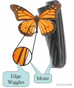 為了反映鏡像邊帶沒有衰減的效果,圖3b和3c示意了奈奎斯特頻率和時(shí)鐘頻率處的頻譜重疊。這些疊加的鏡像邊帶信號(hào)(圖3d)與視頻信號(hào)相比具有隨機(jī)的相位差。圖4表示我們需要避免的圖像誤差。“邊緣擺動(dòng)”是高頻邊緣干擾,它重疊在視頻信號(hào)上,具有隨機(jī)變化的相位。摩爾效應(yīng)是時(shí)鐘、視頻信號(hào)頻率之間相互作用的結(jié)果。