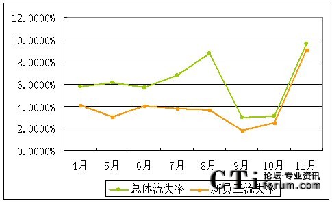 從該中心的運營數(shù)據(jù)來看,另一個發(fā)生明顯變化的就是實行團(tuán)隊激勵后新員工的流失率開始明顯增加。以下是我們提取4-11月該呼叫中心員工流失方面的數(shù)據(jù):