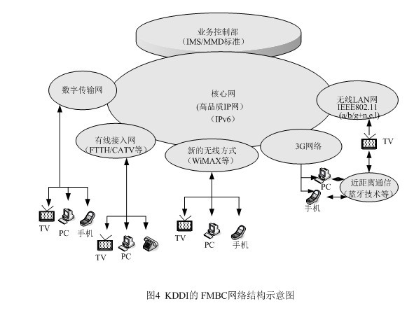 為了在市場競爭中立于不敗之地,KDDI另辟稀徑,提出了將固定網(wǎng)、移動(dòng)網(wǎng)、因特網(wǎng)和電視廣播相融合的概念,它與朝日新聞、朝日電視簽署合作框架,就是它的集中代表。FMBC是超3G的構(gòu)想,是以移動(dòng)通信為基礎(chǔ),與固定電話網(wǎng)及因特網(wǎng)進(jìn)行融合,現(xiàn)在又把廣播電視納入,這樣它就成了KDDI的NGN了。FMBC的網(wǎng)絡(luò)結(jié)構(gòu)請(qǐng)見圖4。從圖4上不難發(fā)現(xiàn)NGN的影子,特別是業(yè)務(wù)控制部的設(shè)立,并采用ISM/MMD標(biāo)準(zhǔn),將網(wǎng)絡(luò)與應(yīng)用分開,以利新業(yè)務(wù)的開拓,同時(shí)完成核心網(wǎng)的IP化,這些都是NGN的基本概念。