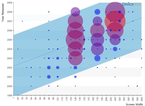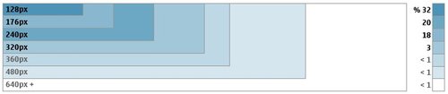 還有一點(diǎn),不到5%的設(shè)備寬度大于320個(gè)像素。但這一數(shù)字可能會在未來有所提升,目前已經(jīng)可以看到,小屏幕(128,176等)設(shè)備正逐漸被大屏幕(240+)設(shè)備所代替。下面的圖表給出了相關(guān)的分析。