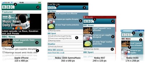 BBC還可以為特定的設(shè)備(或是一組設(shè)備)重新編排一些內(nèi)容。iPhone有非常豐富的功能,因此iPhone版的BBC還有音樂下載選項(xiàng),而其他的設(shè)備可能只會顯示今天最熱門的‘BBC新聞’。可以根據(jù)數(shù)據(jù)的大小,多媒體的處理能力甚至是屏幕的尺寸決定是否需要針對iPhone提供更加豐富的內(nèi)容。以Nokia 6680上的‘特色’顯示為例,它大部分的顯示內(nèi)容是讓用戶滾動(dòng)屏幕查看今天最熱門新聞故事。iPhone上顯示了三個(gè)新聞故事,而其中只有一篇配有插入。這使得用戶無需滾動(dòng)屏幕就可以大致了解全部的咨詢。