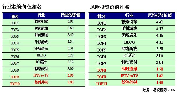 易觀國際投資分析師李璟對記者介紹:“本次評估中十大熱點領域的前8名都具有投資價值。但位居最后的 IPTV 和軟件外包行業(yè),雖然投資價值得分低于3分,并不代表其三年后沒有投資價值,易觀國際的行業(yè)投資價值評估模型是以3年作為一個評估周期的。我們認為