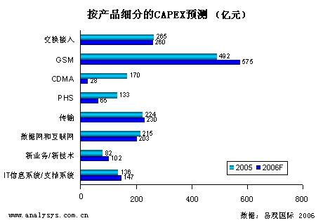 易觀國際預(yù)測2006年全國電信運營商的資本總開支為2053億(不包括 3G 資本開支),比2005年下降1%?偟目磥恚\營商在