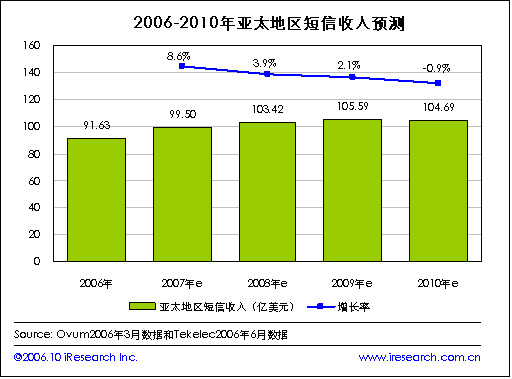 iResearch艾瑞市場咨詢根據(jù)咨詢公司Ovum和網(wǎng)絡(luò)應(yīng)用公司Tekelec在2006年的數(shù)據(jù)整理發(fā)現(xiàn),到2010年亞太地區(qū)的短信收入有望達(dá)到104.69億美元,2006年亞太地區(qū)的短信收入在91.63億美元。