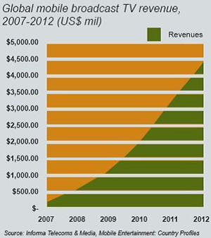 根據(jù)市場研究公司Informa Telecoms &Media的調查數(shù)據(jù)顯示,移動電視市場在韓國、意大利和美國市場帶動下,將在2007年達到美金2.19億元;至2012年,移動電視市場預計能產(chǎn)生美金44億元的收益,而美國將成為最大的單一市場,占有全球20%的收益。Informa甚至認為在2009年,美國就可超越韓國,成為移動電視最大的單一市場。