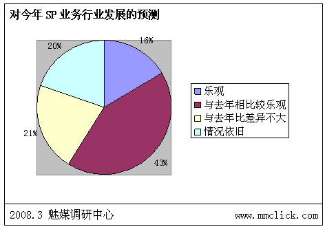 最近公布的空中網(wǎng)財(cái)務(wù)報(bào)表的數(shù)據(jù)顯示空中網(wǎng)總收入環(huán)比增長,結(jié)合之前廣東移動(dòng)推出:廣東移動(dòng)向重服務(wù)轉(zhuǎn)變 首推“6+1”服務(wù),SP行業(yè)可以說是暖風(fēng)頻吹。魅媒無線行業(yè)調(diào)研中心隨機(jī)從3月3日到3月5日隨記電話采訪50多家全網(wǎng)以及廣東省網(wǎng)SP公司相關(guān)負(fù)責(zé)人,對最近的SP行業(yè)的政策調(diào)整進(jìn)行調(diào)查,有以下的數(shù)據(jù):
