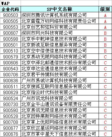 從榜單上可以看到,在短信業(yè)務(wù)上,北京星潮在線文化發(fā)展有限公司、北京雷霆萬鈞網(wǎng)絡(luò)科技有限責任公司和南京網(wǎng)典科技有限公司獲A評級。深圳市騰訊計算機系統(tǒng)有限公司、北京雷霆萬鈞網(wǎng)絡(luò)科技有限責任公司和北京創(chuàng)藝和弦科貿(mào)有限公司獲得WAP業(yè)務(wù)的A評級。