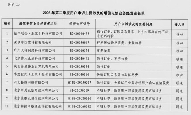2.2008年二季度用戶申訴主要涉及的增值電信業(yè)務(wù)經(jīng)營者名單
