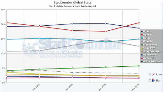 根據(jù)StatCounter的統(tǒng)計(jì)數(shù)字,Opera的移動瀏覽器在5月幾乎完全從2009年一到四月每月穩(wěn)定下降三個(gè)百分比的低潮中恢復(fù)過來了。StatCounter在1月特別點(diǎn)出 Opera在移動瀏覽市場的占有24.69%,比這個(gè)月高出0.05%。不論這個(gè)月的使用數(shù)字到底為何,至少數(shù)字回升了,這無疑是Opera值得驕傲的事。
