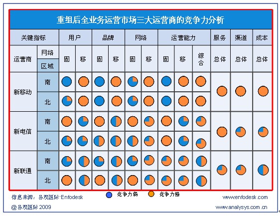 盡管產(chǎn)業(yè)鏈完備程度相差較為明顯,但運營商各自業(yè)務與用戶服務運營能力對3G時常的發(fā)展影響也至關重要,根據(jù)易觀國際Enfodesk發(fā)布的《國內(nèi)運營商3G業(yè)務發(fā)展策略研究系列—中國3G市場現(xiàn)狀與發(fā)展策略概述》報告顯示,在發(fā)展3G的過程中,三大運營商各自有一定的優(yōu)劣勢: