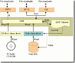 EWF能夠使操作系統(tǒng)可以從只讀媒體(如 CD ROM、寫(xiě)保護(hù)硬盤(pán)或閃存)中啟動(dòng)。所有對(duì)受到 EWF保護(hù)的卷進(jìn)行的寫(xiě)入都被重定向到覆蓋。這些寫(xiě)入被緩存在覆蓋中并且作為卷的一部分提供。這會(huì)產(chǎn)生該卷可寫(xiě)的表象。覆蓋可能存在于磁盤(pán)或隨機(jī)訪問(wèn)內(nèi)存 (RAM) 中。如果需要,可以將覆蓋中存儲(chǔ)的數(shù)據(jù)提交給受保護(hù)的卷。