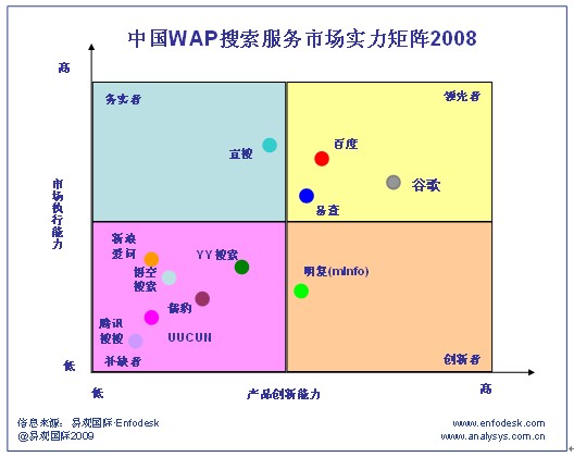 2008年WAP搜索實力矩陣中領(lǐng)先者百度、谷歌、易查。百度、谷歌憑借其在互聯(lián)網(wǎng)領(lǐng)域強大的資源和技術(shù)優(yōu)勢在移動搜索市場仍處于WAP搜索市場的領(lǐng)先者地位,其中2008年百度逐漸提高對于產(chǎn)品、商業(yè)模式等方面的重視,并加大了一定的投入,但產(chǎn)品有待完善、商業(yè)模式的探索需進一步加快腳步;谷歌一年中不斷豐富產(chǎn)品,移動搜索市場的投入勢頭較高,但針對細分產(chǎn)品的用戶挖掘需進一步提升;而易查通過多年的運營也在移動搜索領(lǐng)域占據(jù)領(lǐng)先者位置。