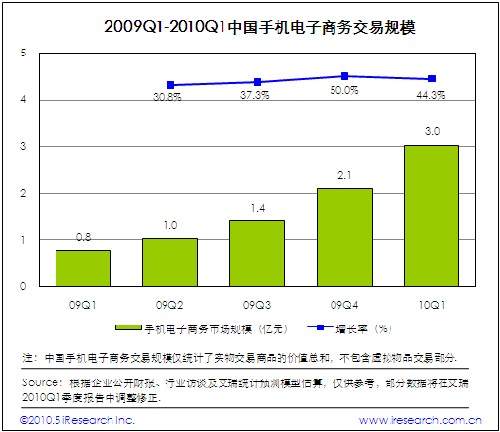 根據(jù)艾瑞咨詢即將發(fā)布的2010年第一季度中國移動互聯(lián)網(wǎng)市場數(shù)據(jù)顯示,2010Q1中國移動互聯(lián)網(wǎng)市場整體交易規(guī)模達(dá)到44.9億,環(huán)比增長5.2%。艾瑞咨詢分析認(rèn)為,盡管電信運營商計費政策調(diào)整,對移動增值市場收入產(chǎn)生負(fù)面影響,但是手機(jī)電子商務(wù)、手機(jī)搜索等業(yè)務(wù)領(lǐng)域的良好市場表現(xiàn),推動移動互聯(lián)網(wǎng)市場規(guī)模平穩(wěn)增長。