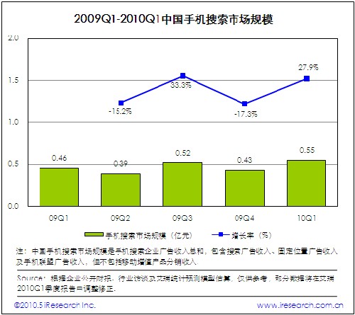 2010Q1中國手機(jī)搜索市場規(guī)模為5500萬,環(huán)比增長27.9%,手機(jī)搜索請求量和PV的大幅增長帶動廣告收入增加。自2009年下半年以來,受手機(jī)上網(wǎng)用戶規(guī)模迅速發(fā)展以及用戶活躍度和黏性顯著增加的影響,手機(jī)搜索市場進(jìn)入快速發(fā)展階段。與此同時,手機(jī)搜索企業(yè)紛紛加大市場投入力度,建立與電信運營商和手機(jī)終端廠商的深度合作關(guān)系是業(yè)務(wù)拓展的重點方向。此外,網(wǎng)頁產(chǎn)品和客戶端軟件深度整合也是手機(jī)搜索企業(yè)布局移動互聯(lián)網(wǎng)市場的最佳實踐。受谷歌事件影響,艾瑞預(yù)計2010Q2手機(jī)搜索市場集中度將進(jìn)一步提高。