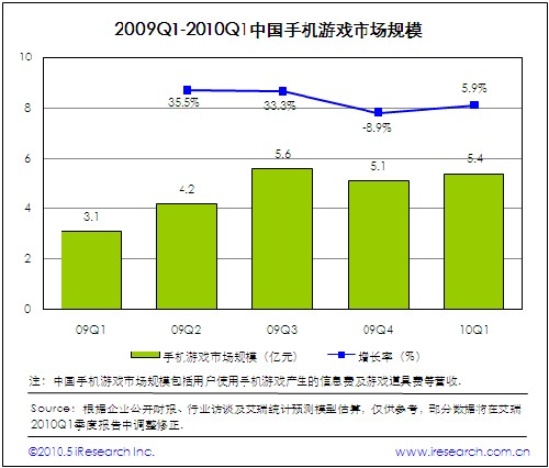 2010Q1中國手機(jī)游戲市場規(guī)模為5.4億,環(huán)比增長5.9%.2009年底電信運營商調(diào)整業(yè)務(wù)合作伙伴計費政策,導(dǎo)致WAP和G+手機(jī)游戲平臺等特定計費平臺暫時停止計費,對手機(jī)游戲市場營收增長產(chǎn)生不利影響。除了季節(jié)因素以外,手機(jī)單機(jī)游戲受電信運營商暫停WAP計費影響較大,手機(jī)網(wǎng)游受政策影響有限。盡管本季度手機(jī)游戲市場扭轉(zhuǎn)營收規(guī)模下滑的不利局面,重新恢復(fù)增長態(tài)勢,但是手機(jī)游戲?qū)﹄娦胚\營商計費通道的高依存度,決定行業(yè)受政策風(fēng)險的影響較大。實現(xiàn)營收多元化是手機(jī)游戲業(yè)界思考和關(guān)注的問題。