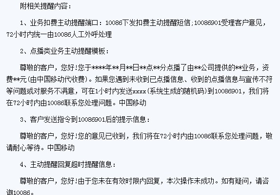 四川移動(dòng)表示,將于今天完成系統(tǒng)改造和上線(xiàn)點(diǎn)播類(lèi)業(yè)務(wù)的扣費(fèi)主動(dòng)提醒功能。為此,四川移動(dòng)給各大SP廠商下達(dá)了通知,并附上了提醒內(nèi)容。從9月1日期,10086對(duì)于用戶(hù)開(kāi)通的業(yè)務(wù)將會(huì)下發(fā)扣費(fèi)主動(dòng)提醒短信。此外,中國(guó)移動(dòng)10086901將受理客戶(hù)意見(jiàn),在72小時(shí)內(nèi)統(tǒng)一由10086人工外呼處理。對(duì)于用戶(hù)開(kāi)通的點(diǎn)播類(lèi)業(yè)務(wù),中國(guó)移動(dòng)設(shè)置了“點(diǎn)播類(lèi)業(yè)務(wù)主動(dòng)提醒模板”不僅提醒用戶(hù)開(kāi)通了點(diǎn)播類(lèi)業(yè)務(wù)還為用戶(hù)點(diǎn)播過(guò)程中出現(xiàn)的問(wèn)題給出了解決途徑。