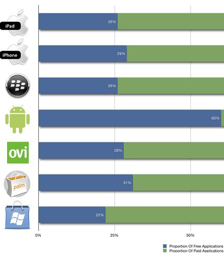 Windows市場中的免費應(yīng)用程序比例最少,僅占其應(yīng)用程序總量的22%;其次為蘋果iPad應(yīng)用程序商店,其免費應(yīng)用程序比例為26%。iPhone應(yīng)用程序商店中,免費應(yīng)用程序的比例為29%。在付費應(yīng)用程序方面,Android市場及Palm公司應(yīng)用程序商店中前100名熱銷應(yīng)用程序價格平均值高于所有收費應(yīng)用程序價格均值。