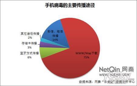 感染途徑方面,《2010年中國大陸地區(qū)手機安全報告》指出,據網秦“云安全”數據分析中心統(tǒng)計,當前通過手機訪問wap和www網站感染病毒的比率達75%;通過短信、彩信感染病毒的比率占14%;通過藍牙傳輸方式感染病毒的比率占6%;通過存儲卡等途徑感染病毒的比率占3%;另外2%的用戶則是被其它傳播途徑的病毒感染。其中聯網感染病毒的機率最大,成為用戶面臨的最主要威脅。