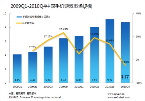 2010年Q4手機(jī)游戲市場規(guī)模8.77億首次出現(xiàn)負(fù)增長