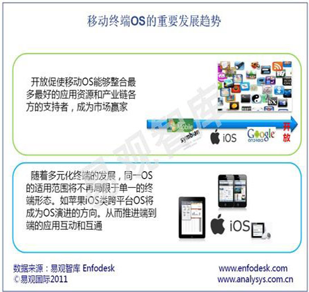 易觀國際(Analysys International)在近期發(fā)布易觀智庫Enfodesk《中國移動互聯(lián)網(wǎng)行業(yè)年度綜合報告2011》中對于移動終端OS部分進(jìn)行了深入的研究。易觀國際認(rèn)為,隨著3G和移動互聯(lián)網(wǎng)的迅猛發(fā)展,多樣化的移動應(yīng)用體系逐漸形成,促使具有獨(dú)立OS的智能手機(jī)市場規(guī)模不斷擴(kuò)大。移動終端OS作為用戶與終端進(jìn)行交互的操作接口,以及移動應(yīng)用、內(nèi)容、服務(wù)運(yùn)行的平臺,對于移動互聯(lián)網(wǎng)的發(fā)展起著至關(guān)重要的意義。未來在各種形態(tài)移動互聯(lián)網(wǎng)應(yīng)用和服務(wù)爆發(fā)性增長的情況下,移動終端OS生態(tài)圈建設(shè)將走向開放,并促使多元化終端之間的互聯(lián)互通,成為終端發(fā)展的新機(jī)遇。