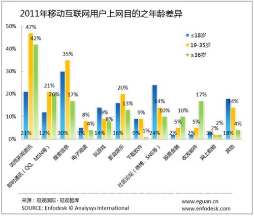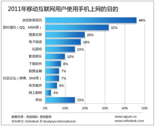 CTI論壇(ctiforum)9月1日消息(記者 潘婷婷):根據(jù)易觀(guān)國(guó)際對(duì)于中國(guó)移動(dòng)互聯(lián)網(wǎng)用戶(hù)最新調(diào)研數(shù)據(jù)顯示,2011年移動(dòng)互聯(lián)網(wǎng)用戶(hù)使用手機(jī)上網(wǎng)的目的中,瀏覽新聞資訊、即時(shí)通訊是集中度最高的兩個(gè)選擇,均占比30%以上,搜索信息、閱讀和玩游戲是用戶(hù)選擇的第二梯隊(duì),第三梯隊(duì)則是影音娛樂(lè)、下載軟件,股票金融和社交。
