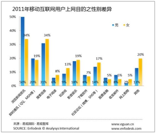 從用戶(hù)性別角度來(lái)看,男性用戶(hù)在瀏覽新聞資訊、股票金融、收發(fā)郵件上的使用上明顯高于女性用戶(hù),與此同時(shí)及時(shí)通訊、社區(qū)論壇、影音娛樂(lè)和玩游戲上女性用戶(hù)的青睞度更高。