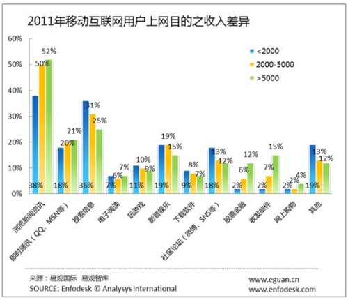 對(duì)于不同收入的用戶(hù),其上網(wǎng)目的也有一定程度的不同,隨著收入的上升,瀏覽新聞資訊的需求明顯增加,即時(shí)通訊需求有所下滑,同時(shí)5000元以上收入的用戶(hù)對(duì)股票金融、收發(fā)郵件的需求有顯著提升。