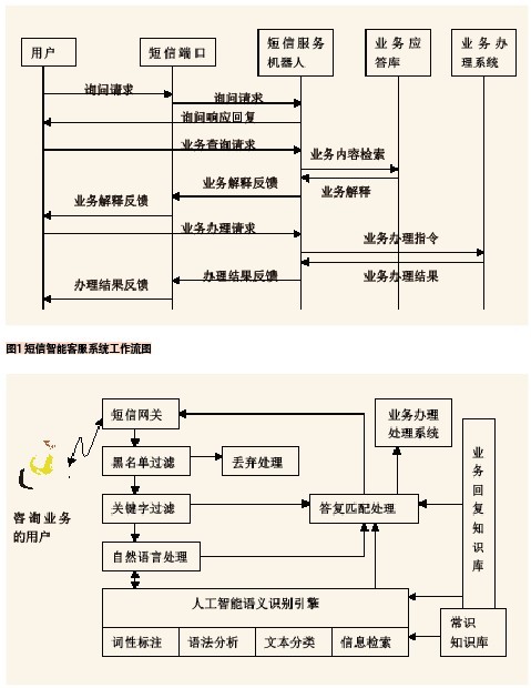 通過自然語言與用戶交互時(shí),降低短信自助服務(wù)的使用門檻,讓所有用戶都能輕易使用。這就要求提供短信服務(wù)的計(jì)算機(jī)系統(tǒng)具有將自然語言系統(tǒng)轉(zhuǎn)換為計(jì)算機(jī)程序能夠處理的形式,并且能將處理結(jié)果轉(zhuǎn)換回自然語言系統(tǒng)。在自然語言處理技術(shù)中,通過特定的計(jì)算機(jī)程序?qū)Χ绦虐l(fā)來的自然語言進(jìn)行詞性標(biāo)注、語法分析、文本分類、信息檢索匹配等一系列處理判斷出用戶的請(qǐng)求意圖,再根據(jù)信息檢索匹配預(yù)置的回復(fù)結(jié)果以短信形式反饋給用戶。