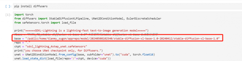 第三步,商城首頁中選擇 SDXL-Lighting 系列模型商品,免費(fèi)購買后點(diǎn)擊“一鍵試用”。進(jìn)入notebook頁面后選擇“Python3.9”內(nèi)核,將第二步復(fù)制路徑粘貼到代碼的 base 變量中,點(diǎn)擊保存。