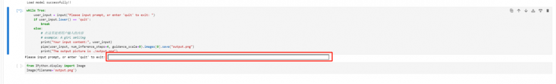第四步,點(diǎn)擊shift+enter運(yùn)行,運(yùn)行完后在紅框處填寫想生成的圖片文字描述,再點(diǎn)擊 shift+enter 運(yùn)行,就會出現(xiàn)針對描述所生成的圖片。