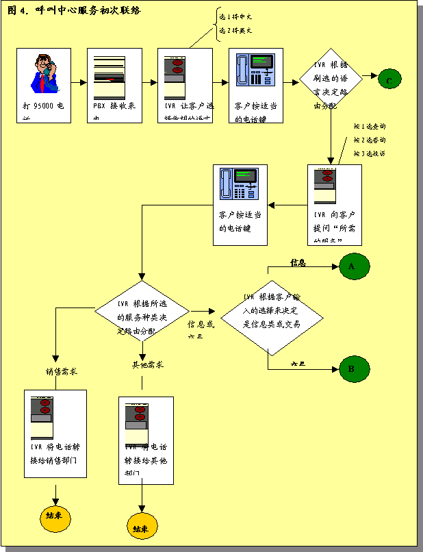 圖4詳細說明了呼叫中心服務初次處理呼叫的過程。根據圖標的內容,將立即撥號呼叫者: