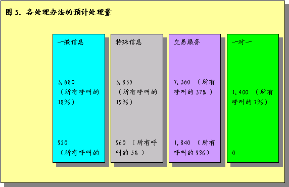 根據預計呼叫量的分析,估計人工代表將處理16300個呼叫,IVR將處理余下的3700個呼叫。圖5圖示了各呼叫處理辦法預計處理的呼叫量。